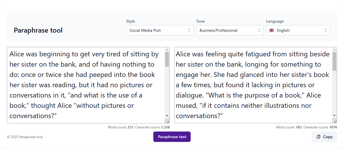 Effortlessly rephrase and translate your text into over 50 languages, ensuring accuracy and adaptability for a wide range of audiences and purposes.